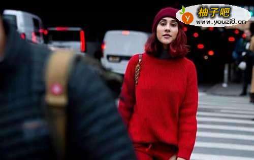 3红色搭配红色,再加上红色帽子,会让人眼前一亮,同时又很有知性美。