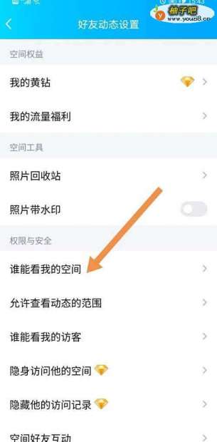 5点击打开好友动态权限设置,找到谁能看我的空间。