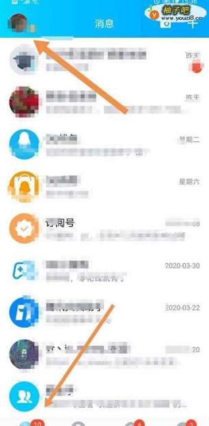打开手机,登录QQ,先点击左下角消息,再点击左上角我的头像。