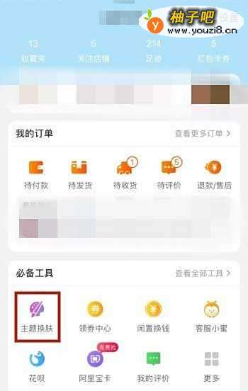 3第三步:在我的淘宝个人控制中心,必备工具下方找到主题换肤按钮,点击该控制按钮,如下图所示: