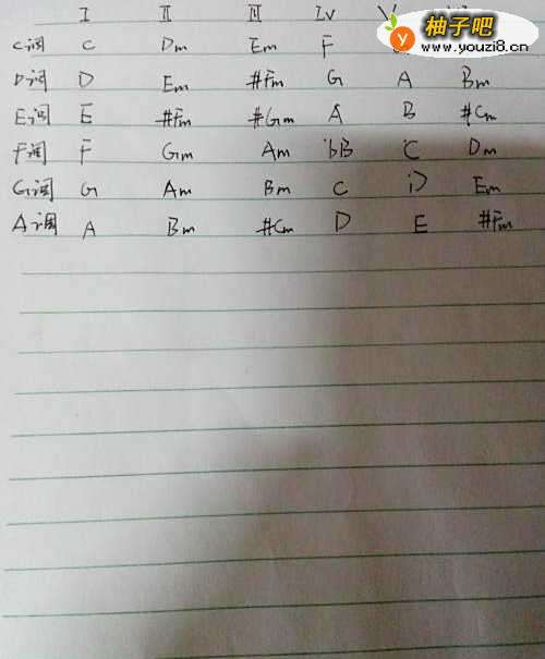 第一步,你需要了解和弦级数,比如你最熟悉的C调中,C Dm Em F G Am和弦分别是1-6级和弦。其它调式中和弦级数我将在下图中画出。