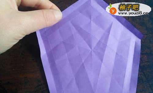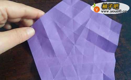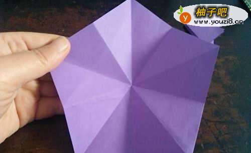 2我们再把每条边向着第一道折痕对折,全部折好后,就是图二的样子。再把第三到折痕向着中间的点对折。如图三。