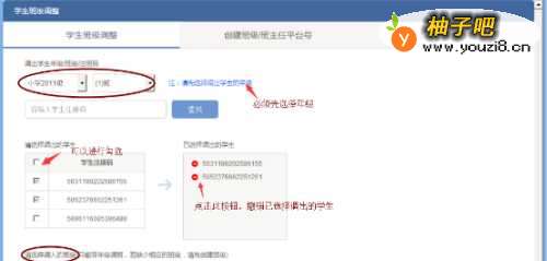4②在“学生班级调整”面板中→选择要调出学生所在的年级,在“不限班级”状态下→在空格里,Ctrl+V复制进注册码,点击“查找”→显示查找出的结果,并勾选选中。