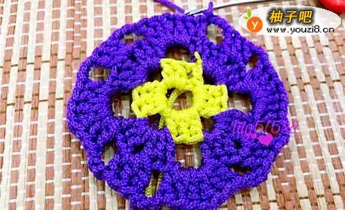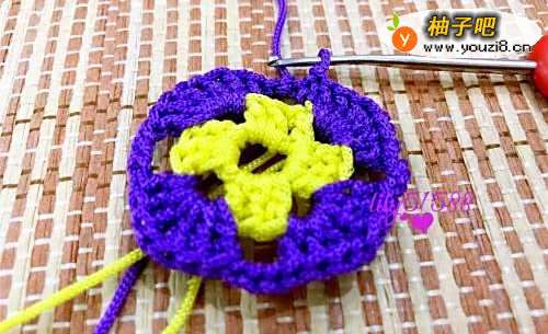 4第三圈:换上紫色的线先立3个辫子针,在第一个洞洞里钩2个长针,钩1个辫子针,再钩3个长针,如图所示;