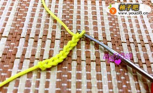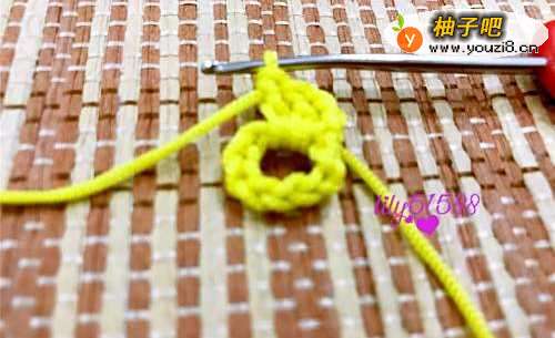 首先拿出亮黄色的钩花线打上一个活结,起针8个辫子针,如图所示;