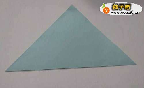 我们先折出一个甜筒,先把一张正方形彩纸对角线对折,形成一个三角形。