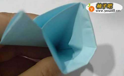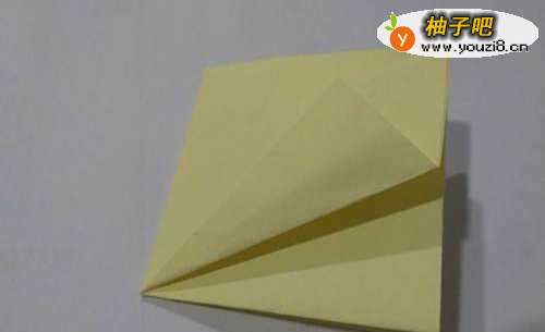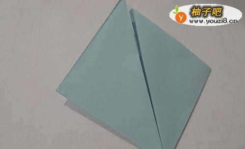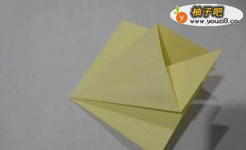 7顺着正方形的一个顶点(无开口的顶点)往里折三角形,然后再把三角形拆开往中间压,就形成了一个等腰三角形。如图所示。