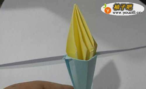 11最后把卷曲好的纸放在之前折好的锥形里,冰淇淋甜筒就做好了。看看像不像啊?能不能达到以假乱真的地步?