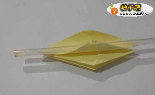 10然后我们把之前准备好的吸管拿出来备用。可以看到中间部分的三角形比较宽,我们现在需要把吸管放在中间的三角部分往里卷,形成卷曲的形状。