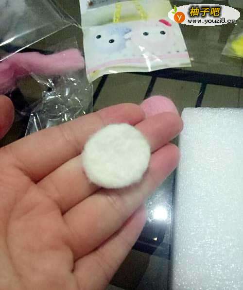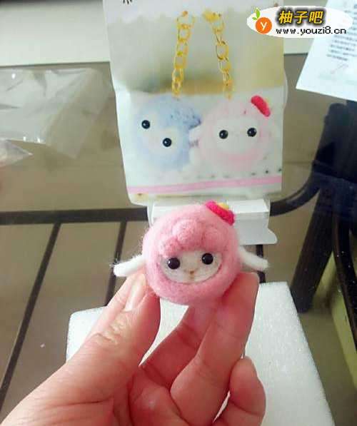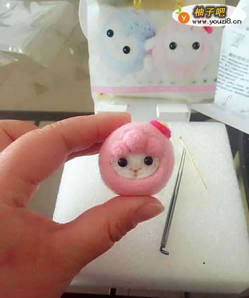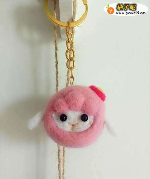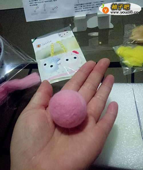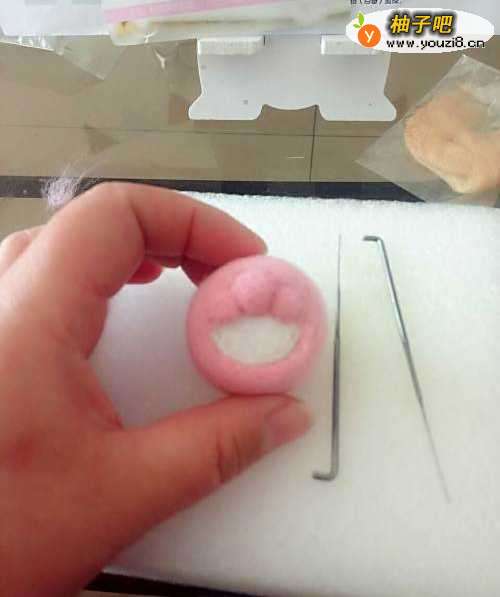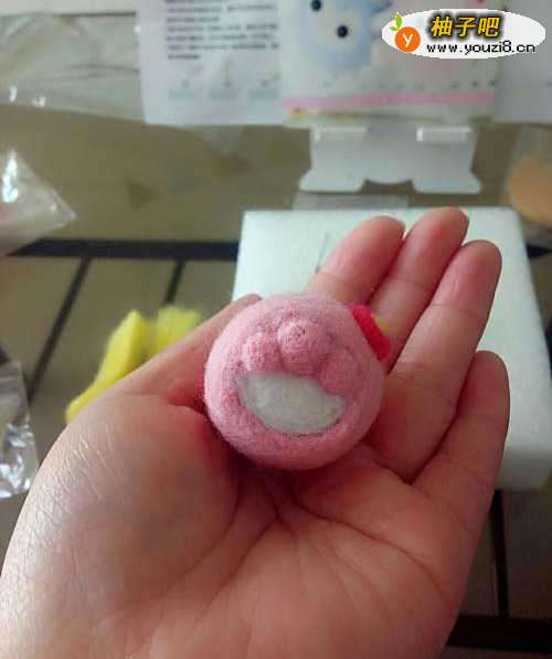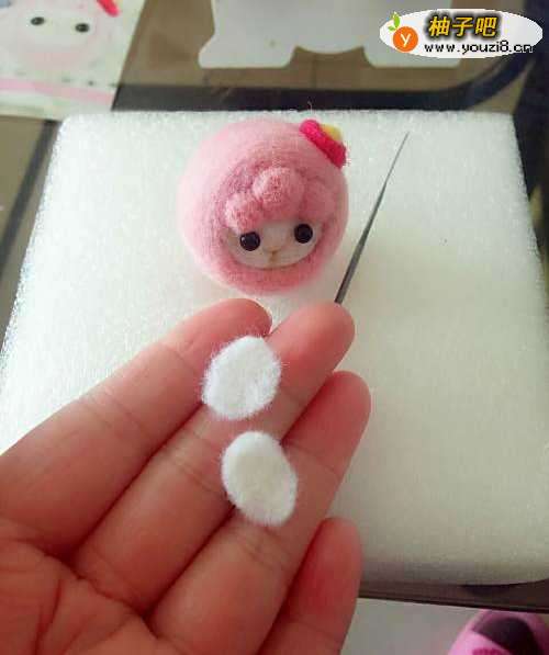 4取白色羊毛毡做羊咩咩的脸少量羊毛毡就可以了将它戳至在粉色圆球上