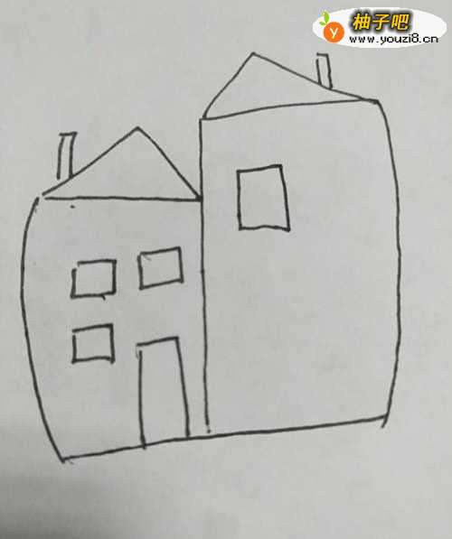 4第四步,在左边的楼房里面画出三个四边形的窗户以及大门。