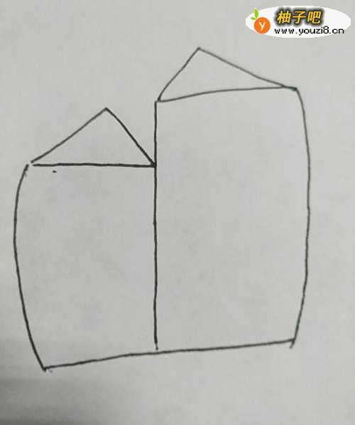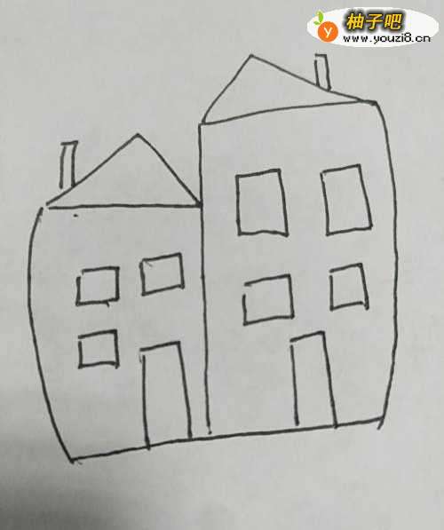 2第二步,在两栋楼房的上面部分画上两个三角形。