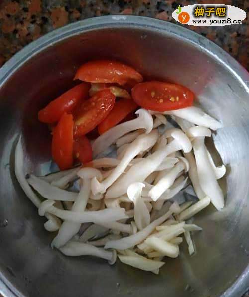 家里就剩下的圣女果2个切片备用,白玉菇撕对半。没有西红柿,用家里剩下的圣女果代替的。