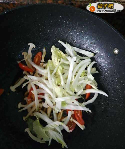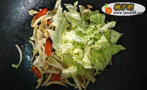 4将稍微煸炒变软的圣女果和白玉菇后,放入白菜根,调入少许白糖,翻炒。