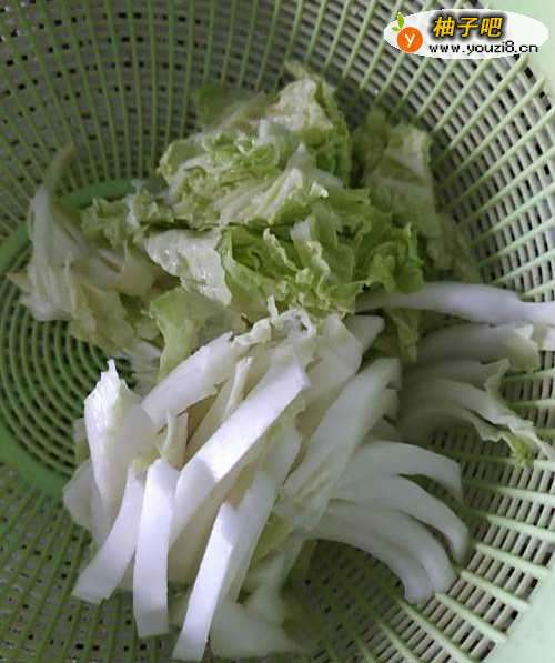 2白菜根切细条,叶子切细备用。