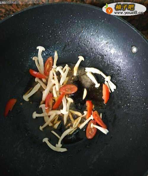 3冷锅放油加热后,放入圣女果和白玉菇煸炒。