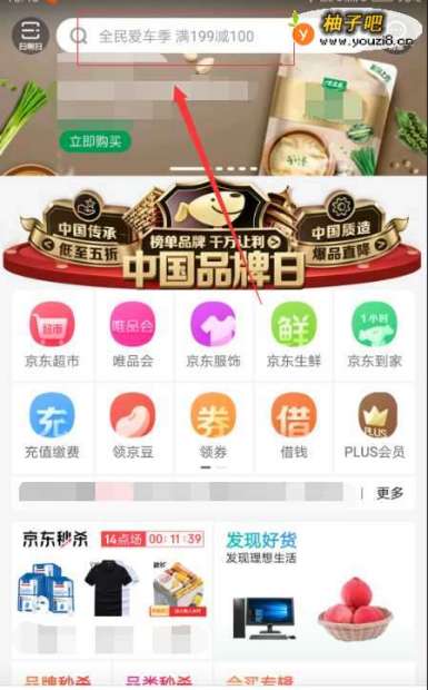 2然后,我们在京东主页面找到上面的搜索框并点击。