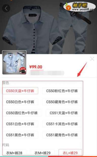6选择衣服属性,比如颜色、尺寸等;然后点击右下角的确定。