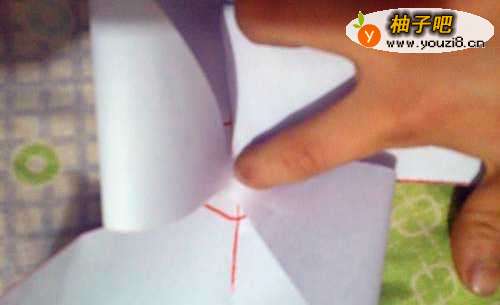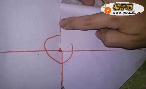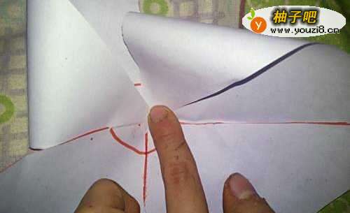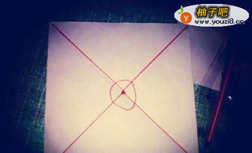 3将正方形纸沿红色的斜线依次裁开,裁到中心圈处即可。然后将一个角如图放在中心圈处。