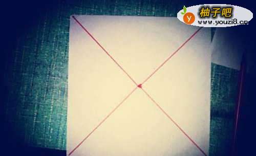 先裁剪一张正方形的纸,然后对折,画出两条斜线。