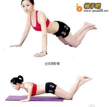 运动要领:不穿bra,直接穿上可以支撑胸部力量的运动款上衣。双膝并拢跪于地上,双脚向后抬起,俯身向前,以双手着地与肩同宽。保持背部挺直并且收紧臀部,慢慢屈臂至胸部接触地面,再慢慢以手肘的力量将身体向上推,回到原位。