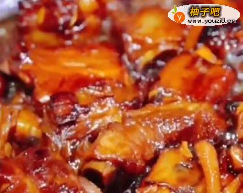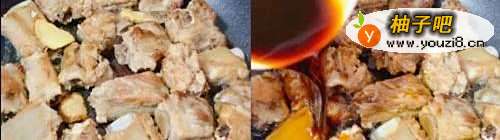 3起锅烧油,放入冰糖,小火慢炒糖色,直至冰糖融化变成枣红色。迅速放入沥干水的肋排,翻炒上色。上色后加入“黄金比例酱汁”继续翻炒一会儿。
