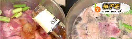 2将肋排切小块,用清水洗净。在锅中加适量清水,烧开后放入肋排、葱结、姜片以及一茶勺料酒。重新煮沸后,用勺子撇去血沫,再将肋排捞出待用。