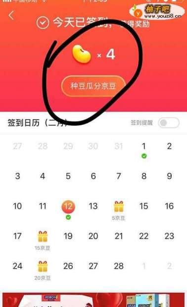 2每日签到可以有京豆,今日已签到有4个京豆