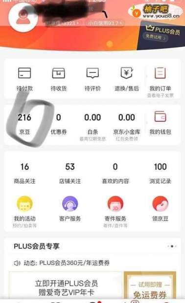打开京东,选择我的,看到小编现在有216个京豆,如何领呢,点击黑色圈圈标识