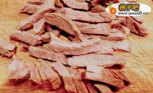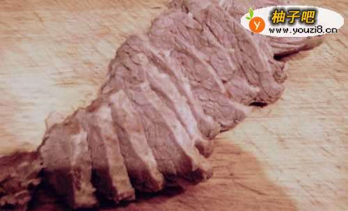 4牛肉不烫手即顺着牛肉纹理先切成片。