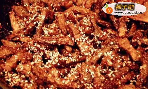 9小火加白糖翻炒、接着放入花椒粉和辣椒粉再放入盐、老抽、蚝油快速翻炒,最后撒上炒熟的白芝麻出锅。