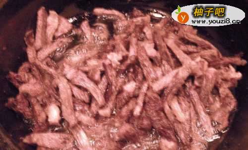 8放牛肉条煸炒,煸干牛肉的水分,全程小火至牛肉表皮变色油清亮即可。太久会失去内部水分失去口感。 将牛肉盛出来,倒出锅中清油只留少许底油,重新放入牛肉。