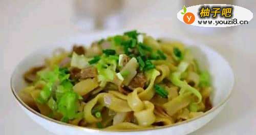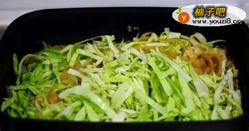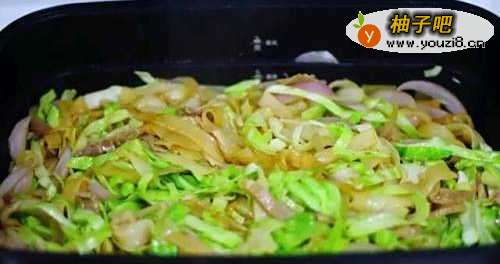 5翻炒至河粉上酱油色之后加入清洗干净切好的圆白菜一起翻炒,配菜可以根据自己喜欢的口味更换为其他蔬菜。