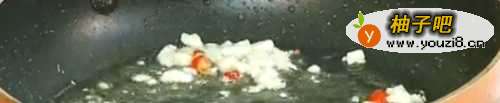 3在锅里放入适量的油,待适温下蒜粒翻炒接着下入青红椒粒炒香。