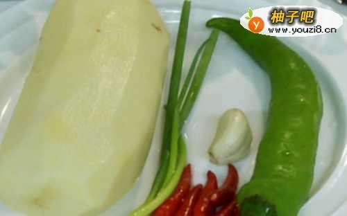 准备食材,将青红椒,蒜切成粒,葱切成葱花,土豆切成均匀大小的片。