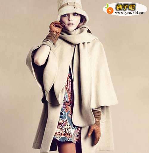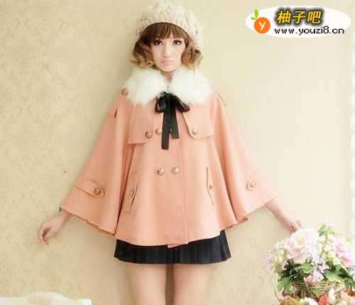 6斗篷式的粉红色呢大衣,毛毛的领子显得可爱而又乖巧,下身搭配上黑色超短裙又在乖巧的基础了增添了一丝俏皮感,配上过膝的长靴,又显得有些性感,这种搭配可是充处伟满小心机的哦
