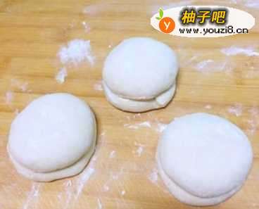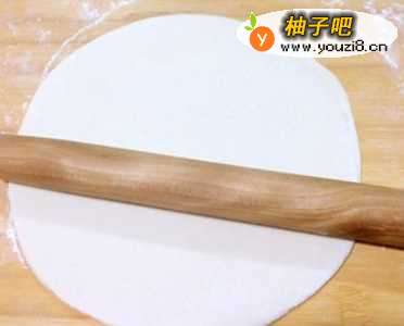 5取一组面团按扁,擀成直径18~20厘米的薄饼!