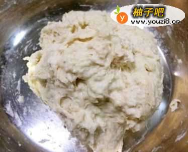 面粉加水和成面团,还是那句话:别一次把水全加进去,因为面粉的吸水量不同,所以水量会有所不同,可根据实际情况稍做调整!总之是一个软软的面团,会很粘手,所以用筷子搅即可,也不必揉光滑,搅匀就行了!然后盖上盖子静置20分钟!