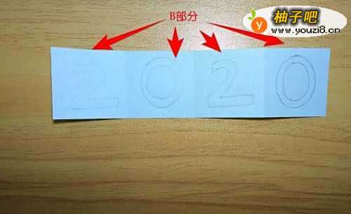 11拿起B部分,左右两次对折后摊开,在各个小正方形分别画出2020四个字。