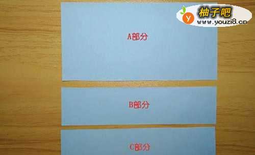 10用剪刀把上面的折痕剪开,成为A部分、B部分和C部分共3部分。