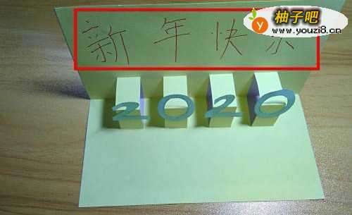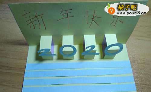 19把它粘贴在贺卡的下面部分,用来装饰,这样新年立体贺卡就制作完成。