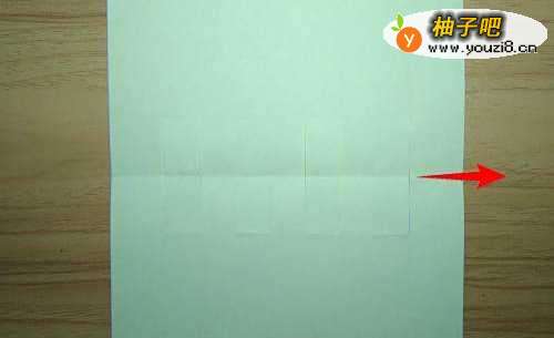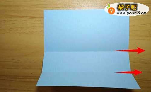 9拿起蓝色彩纸,下边对折到上边后摊开,再把下边对折到中间线后摊开,总的有2条折痕。