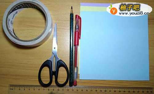 6把黄色彩纸摊开,在其后面如图的位置贴上双面胶。