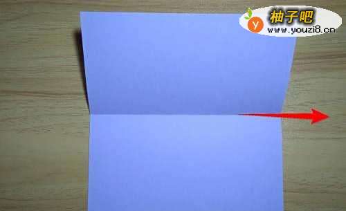 2把紫色彩纸上下对折后摊开,有1条折痕,先放一边。