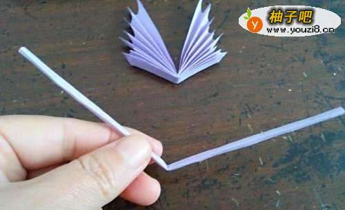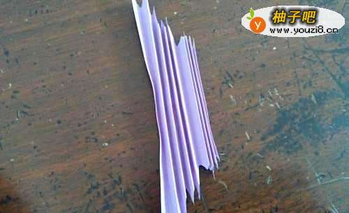 3打开后,我们把剪好的彩纸折成扇子的形状。再把中间对折,如图二。