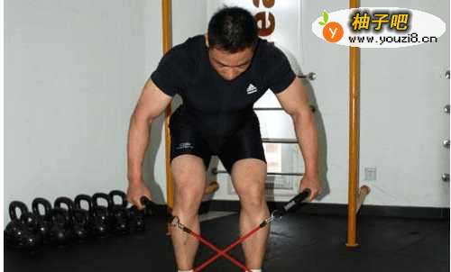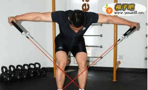 3动作要领:将绳踩在脚下,两脚分开站立,弹力绳在脚上交叉,两膝微屈,屈髋并保持背部挺直,两手握手柄,保持肘关节90°两臂外展,吸气,呼气同时上拉弹力绳至大臂与地面水平。