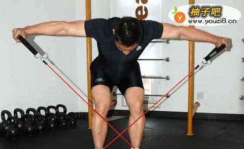 动作要领:两脚分开站立,两膝微屈,屈髋并保持背部挺直,将绳踩在脚下,弹力绳在脚上交叉,两手握手柄,保持肘关节微屈,吸气,呼气同时将两手向两侧平举至与地面平行,吸气同时还原至初始位臵。此练习强化三角肌后束、斜方肌中部菱形肌。这个动作也可以单手来完成。使用八字绳来做会更有挑战。