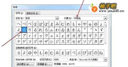 4在“子集”中选择“平假名”,并在下方选中平假名ら,点击“插入”。