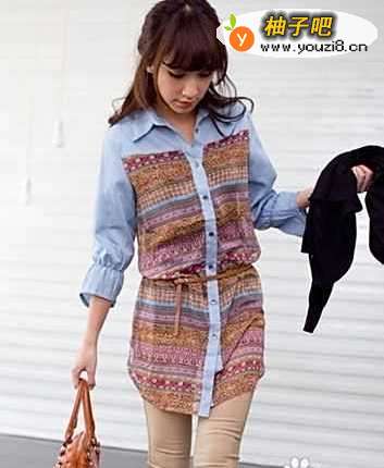 个性时髦的长款衬衫,可以当做连衣裙来穿的。拼接款式,很漂亮的图案,穿在身上大方好看。搭配棕色小腰带,勾勒出腰身,显瘦有型。选择紧身裤和高跟鞋来搭配的话,穿出完美身段。