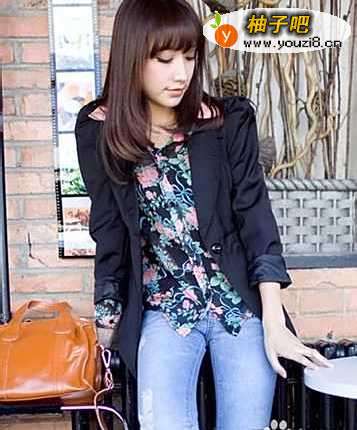 蓝色西装外套,西装是春季流行单品,百搭时髦,宽松版型随性优雅。搭配印花雪纺衬衫,下穿牛仔裤和帆布鞋,特别小清新,很有时尚感呢。